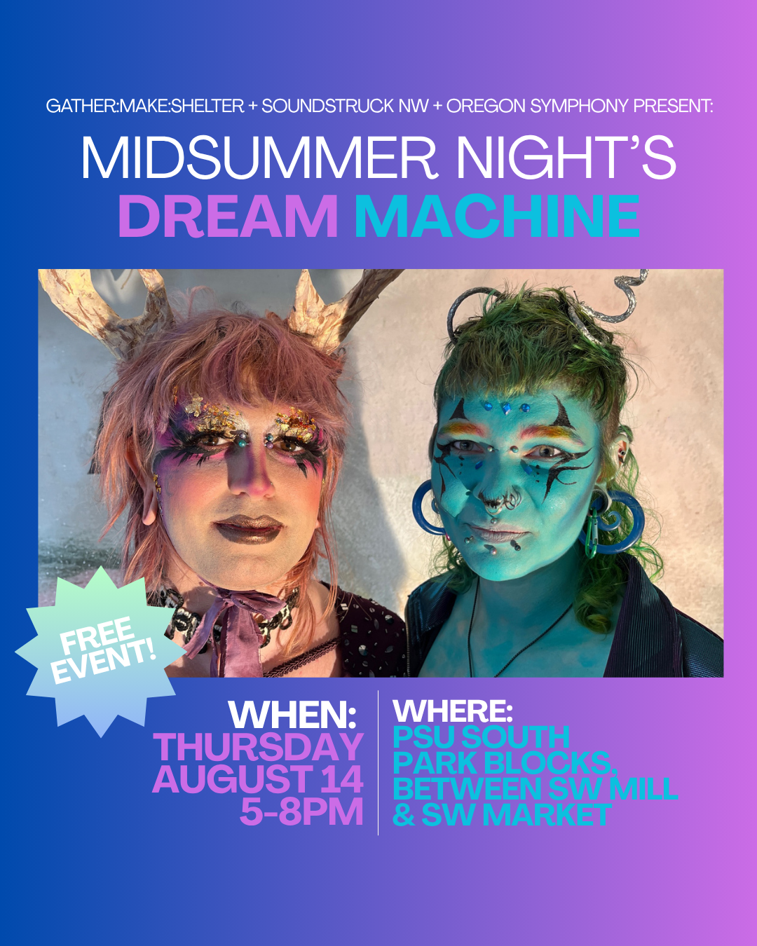PORTLAND, OR – Gather:Make:Shelter, SoundsTruck NW, and Oregon Symphony are proud to present Midsummer Night’s Dream Machine, a free, immersive, family-friendly community celebration of creativity and collaboration set to take place on Thursday, August 14, 2025, from 5:00 to 8:00 PM at the PSU South Park Blocks (SW Mill to SW Market).