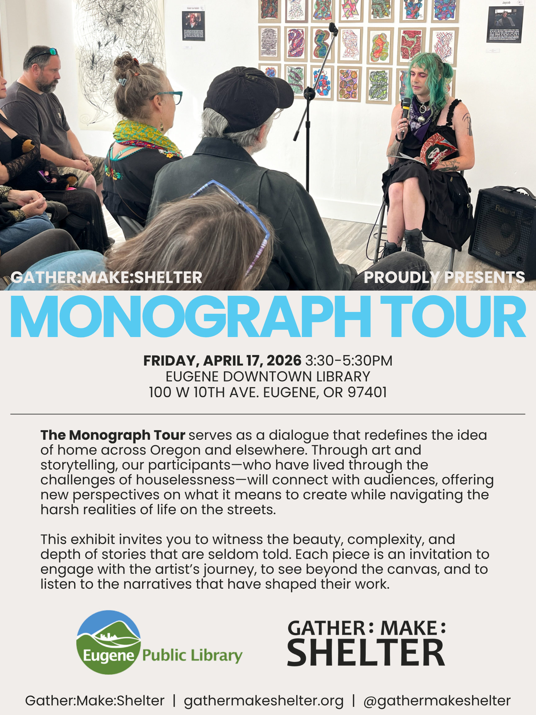 The Monograph Tour features the works of Gather:Make:Shelter artists who reimagine what it means to be an artist and community member. In tandem with their completed creative work, featured artists will speak publicly about the power of creating amidst their experience with houselessness. The Monograph Tour serves as a dialogue that redefines the idea of home across Oregon and elsewhere.