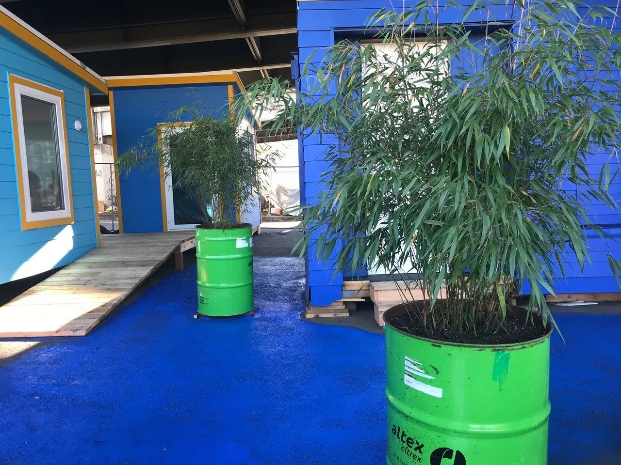 The hygiene hub featured an eighty foot long mural privacy wrap, as well as bright painting and bamboo plants contributed by GMS gardeners.